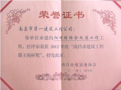 在激烈的市場競爭中,我公司本著負(fù)責(zé)任的態(tài)度,嚴(yán)把工程質(zhì)量關(guān),在“陽明路綜合改造工程”建設(shè)中榮獲2012年度南昌市建筑業(yè)協(xié)會頒發(fā)的“南昌市建筑工程滕王閣杯獎”,同時,梅文華同志獲得“優(yōu)秀項目管理工作者”光榮稱號,為公司贏得了榮譽。