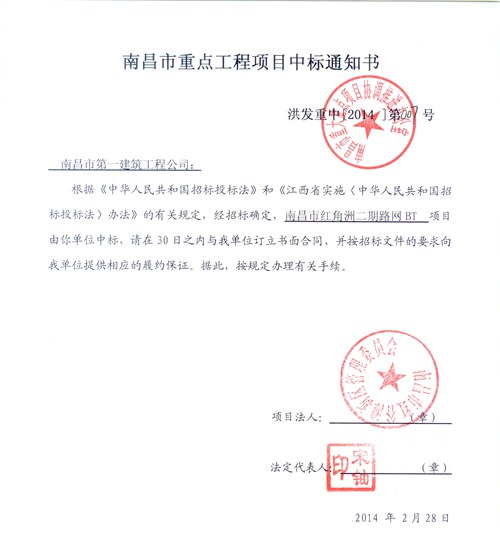 2014年2月25日,南昌市第一建筑工程公司南昌工作部在總公司領(lǐng)導(dǎo)的指導(dǎo)下,以科學(xué)的施工方案為前提,確立合理的下浮系數(shù)及投資回報率,在參與投標(biāo)的多家競爭對手中脫穎而出,一舉中得“南昌市紅角洲二期路網(wǎng)工程BT項(xiàng)目”,公司已于2014年3月6日收到業(yè)主方發(fā)來的中標(biāo)通知書。